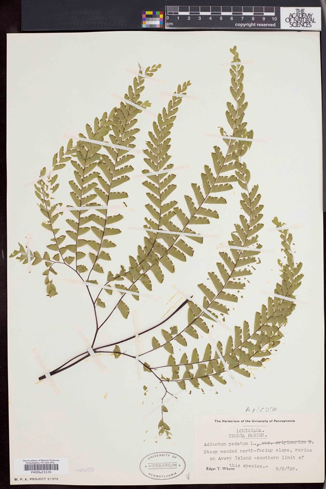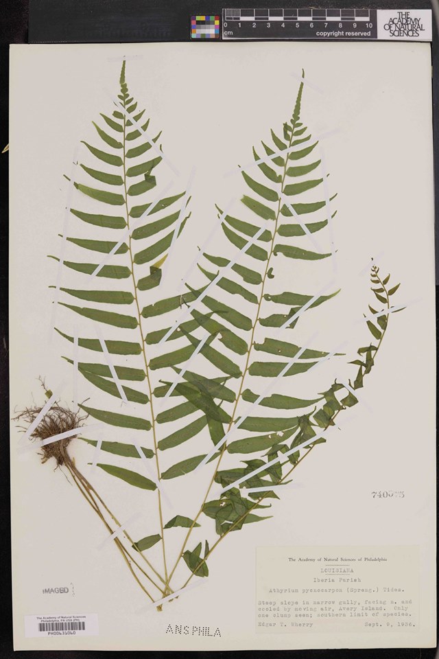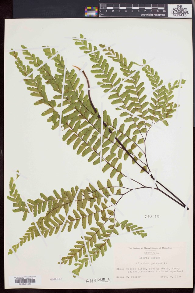 My first search led me to the Philadelphia Academy of Natural Sciences (PANS) where famous botanist Edgar T. Wherry (1885–1982) deposited specimens he collected from Avery Island in 1936. Wherry found two species of North American ferns new to Avery Island, the Adiantum pedatum (“northern maidenhair”) and the Diplazium pycnocarpon (“narrow-leaved glade fern”).