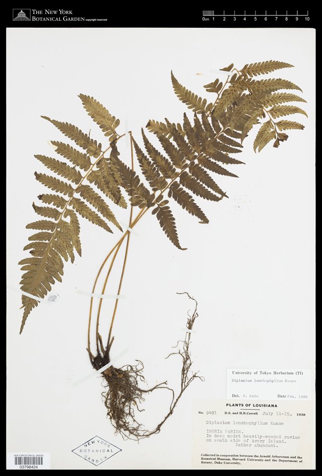 One of those other botanist who visited Avery Island in 1938 was Donovan S. Correll (1908-1983). He collected a specimen of Diplazium loncophyllum (“lanced leaved glade fern”). At that time it was the first and only record known from North America. It is a tropical species occurring in the Caribbean, Mexico, and Central America. Its occurrence on Avery Island is likely due to Gulf winds or storms that transported the spores. Correll made a single collection of this species that is on deposit in the herbarium at the New York Botanical Garden. Once again, the collection data is quite vague: “deep heavily wooded ravine, south side of Avery Island.” He does indicate that the plant is “rather abundant.” This is the only collection of this species known from Avery Island.