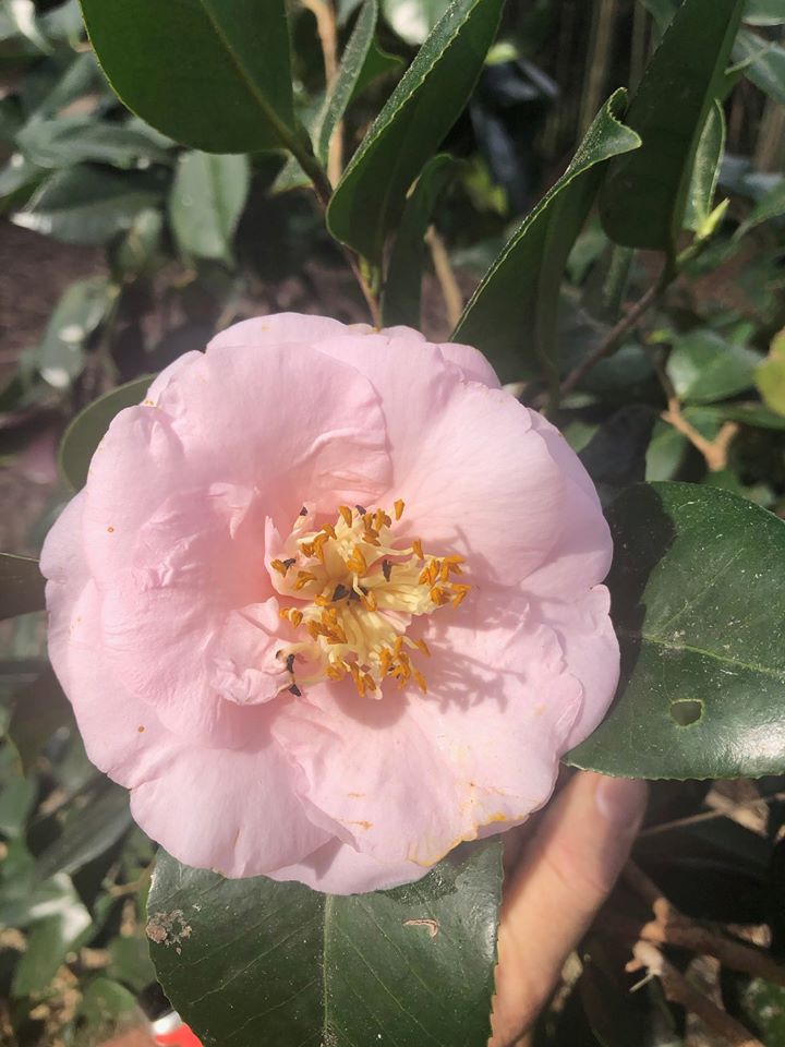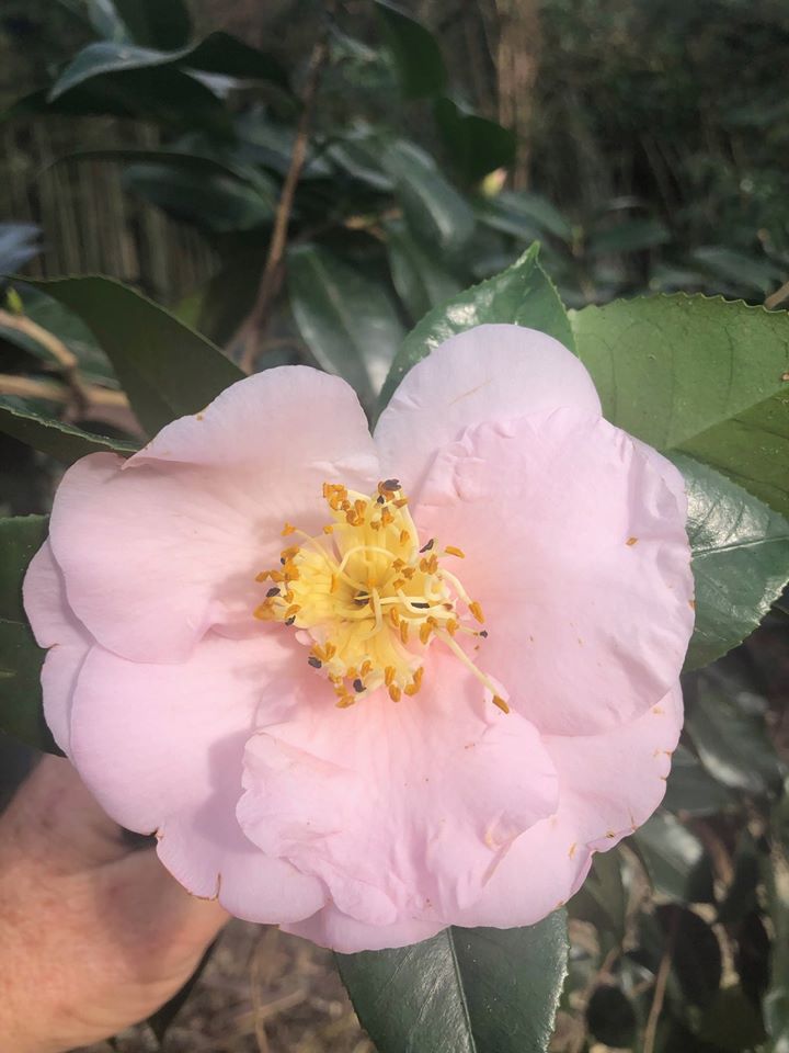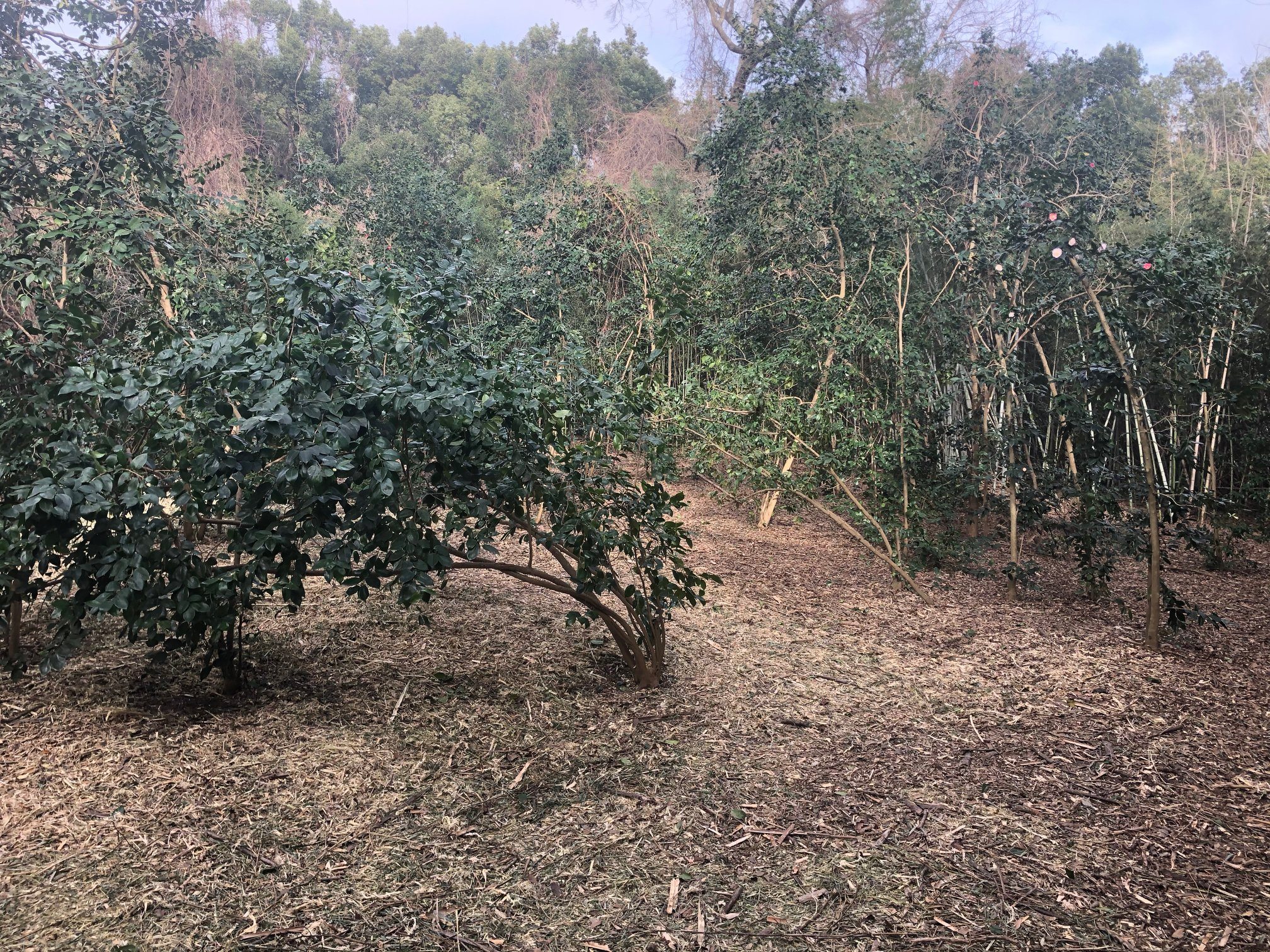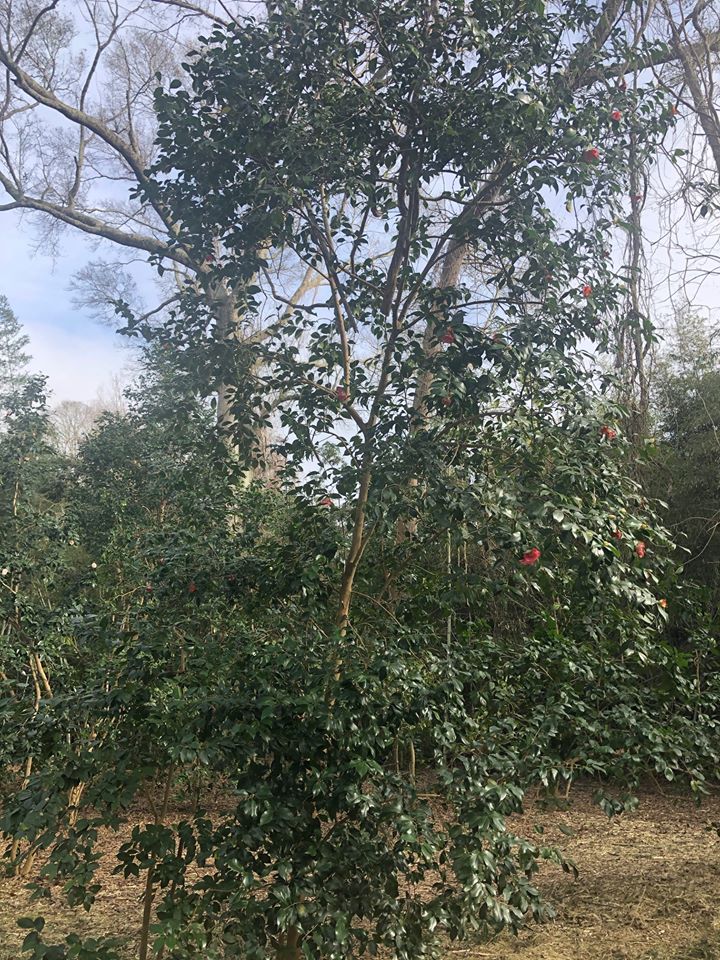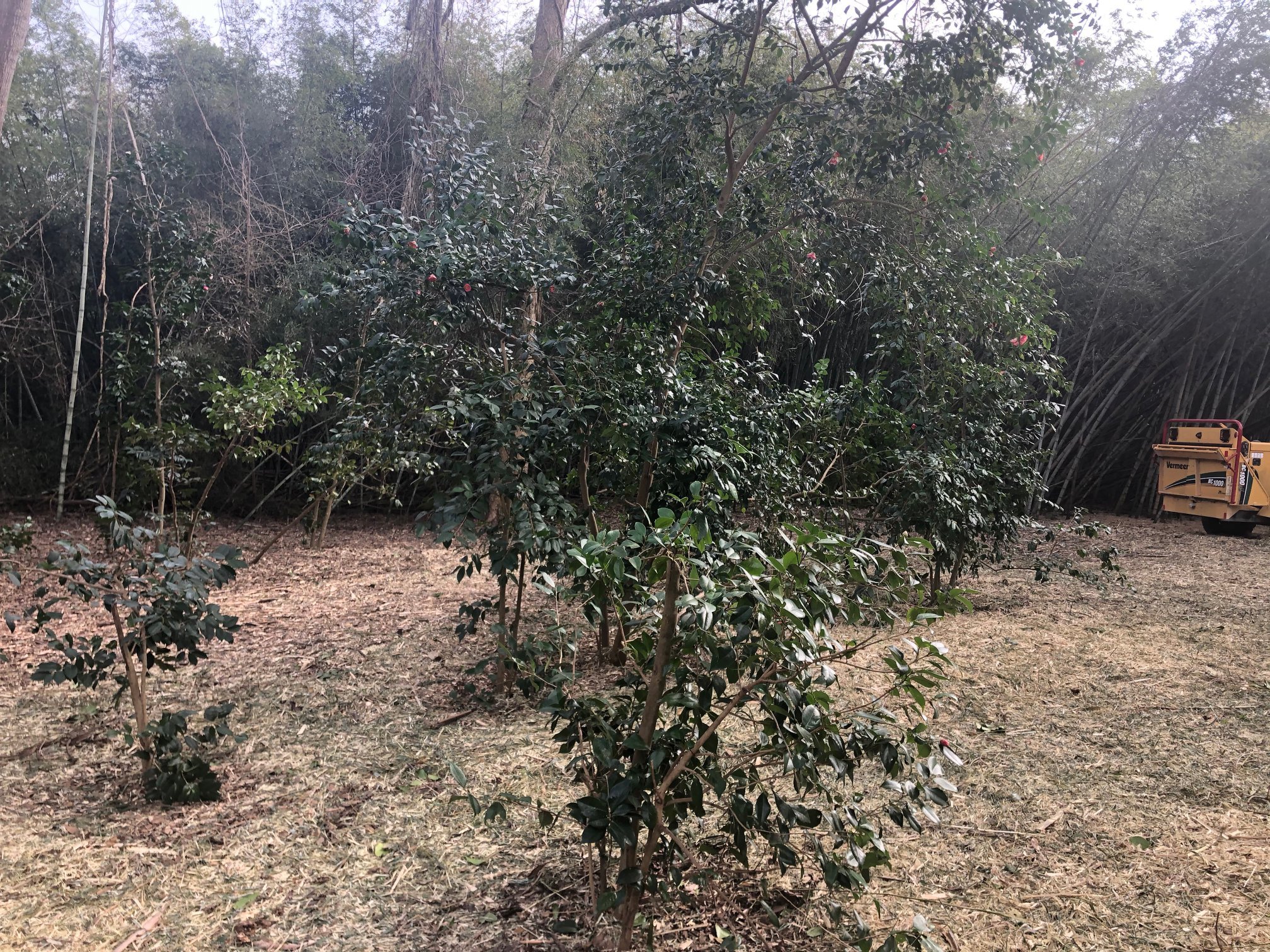 Last week Bernard Patout and his team cleared the bamboo from the entire area where the camellias are growing. What materialized was not just a handful of camellias but no less than 43 camellias, planted in rows covering a substantial area. Some of these camellias are over 25 feet tall, no doubt because they struggled to reach the sun while competing with bamboo. It seems this grove of camellias was consumed by the adjacent bamboo during the last 70+ years and essentially vanished right before our eyes.